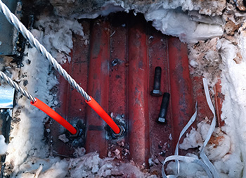 爬升式升降平臺首次安裝前,僅需要在爐膛頂部鰭片上鉆8-16個直徑14mm左右的鋼絲繩孔(根據(jù)鍋爐噸位大小決定開孔數(shù)量),每個吊點處對應開兩個鋼絲繩孔,每一個鋼絲繩孔焊上一個M14左右的螺母,不需要對原有鍋爐進行其他任何的改動。爐膛外面的鋼絲繩端頭懸掛系緊在鍋爐頂部安全系數(shù)3以上的鋼結構梁上,從每個M14螺母中心孔分別引入爐膛內一條鋼絲繩,其中一條連接到提升機上;另一條穿過防傾斜防墜落裝置,操作電控系統(tǒng)帶動檢修平臺上、下升降;檢修完畢,把鋼絲繩從M14的螺母中心孔抽出爐膛,然后擰上M14的螺栓封住即可。